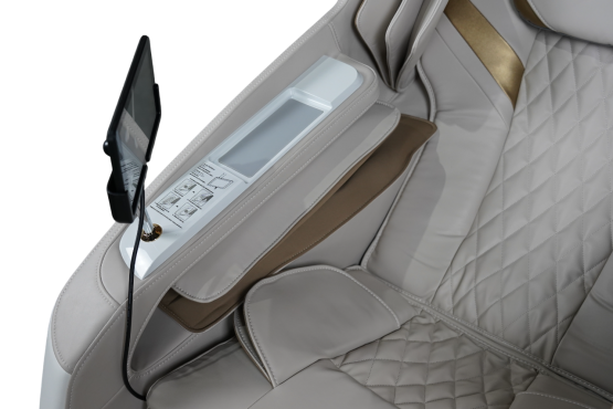 Управляйте вашим массажным креслом умным, и конечно, интуитивно понятным 7-ми дюймовым сенсорным пультом управления, все современные технологии кресла у вас в ладони. Панель управления (с поворотным механизмом) быстрого доступа в подлокотнике избавит вас от лишних движений во время массажа, если вы захотите что-то скорректировать в нем. И куда без подзарядки вашего смартфона - все под рукой, наслаждайтесь в полной мере!