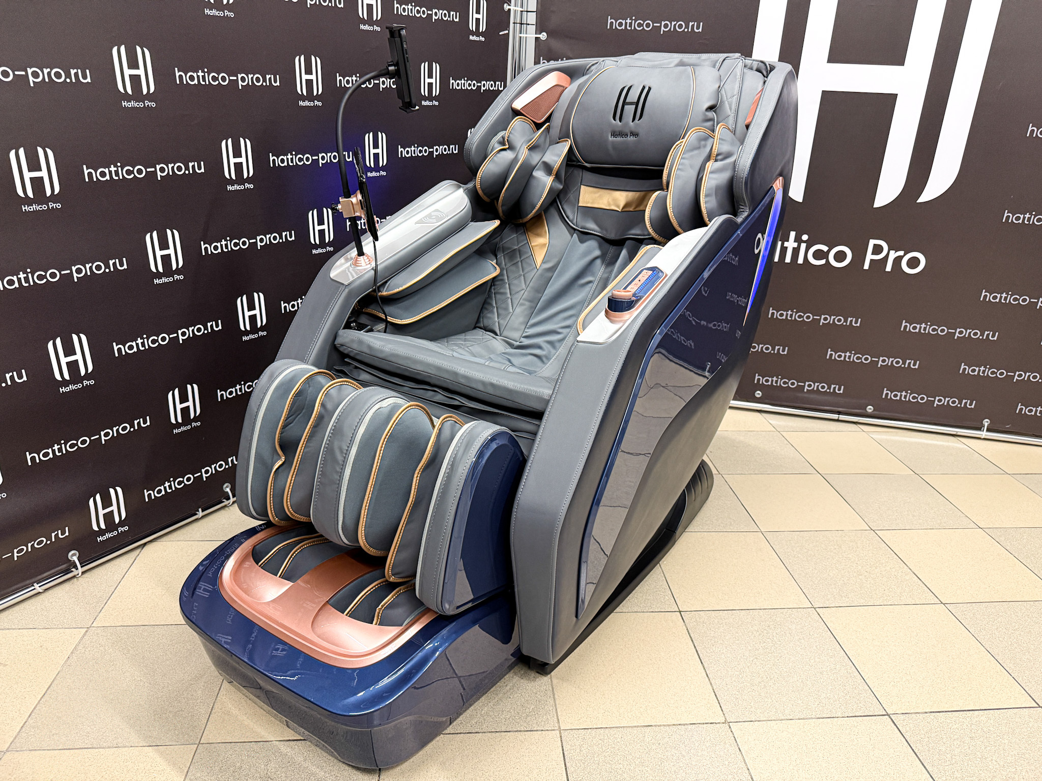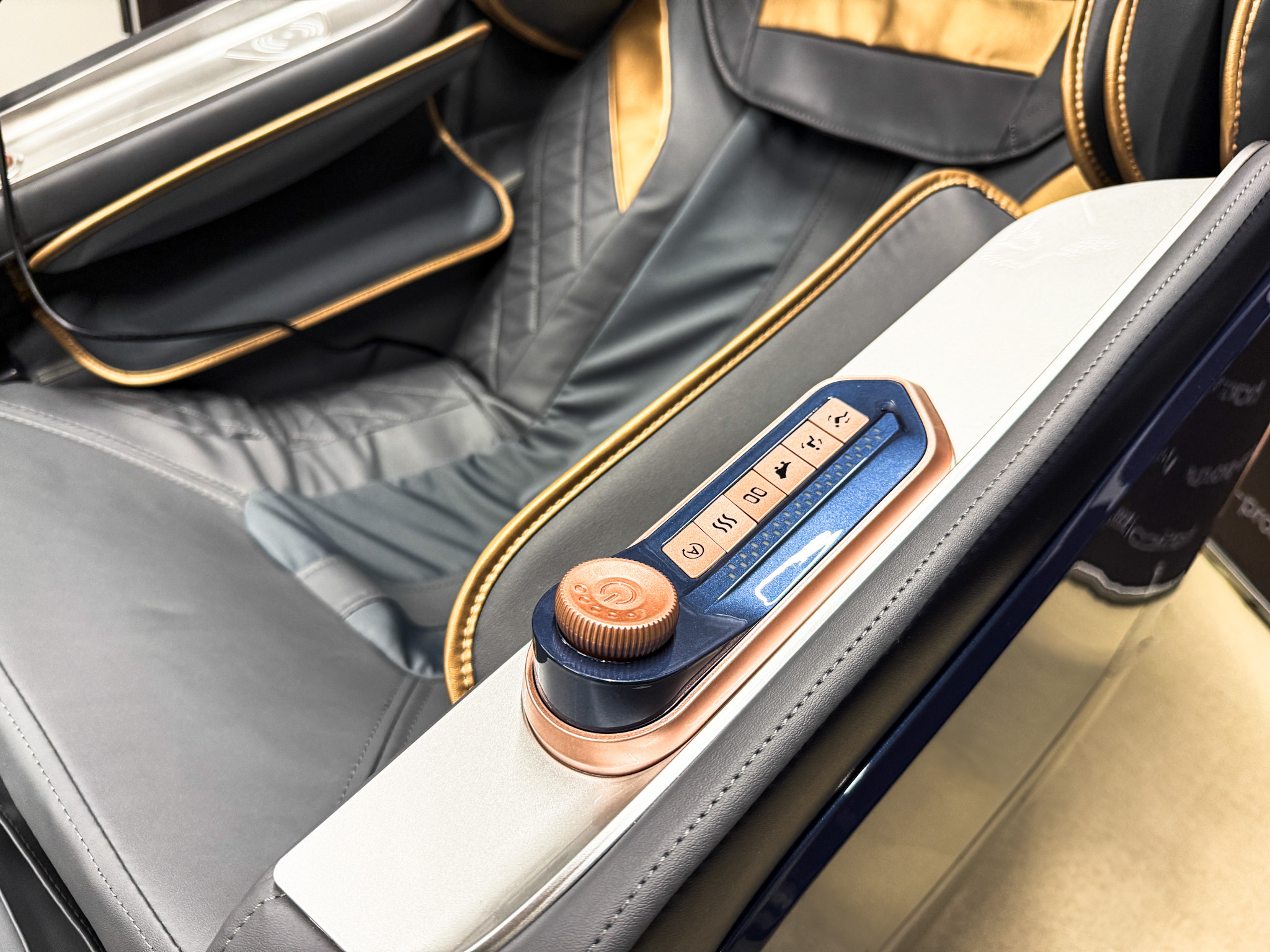 На левом подлокотнике кресла размещён дополнительный пульт управления, предназначенный для оперативного доступа к функциям кресла и техникам массажа.