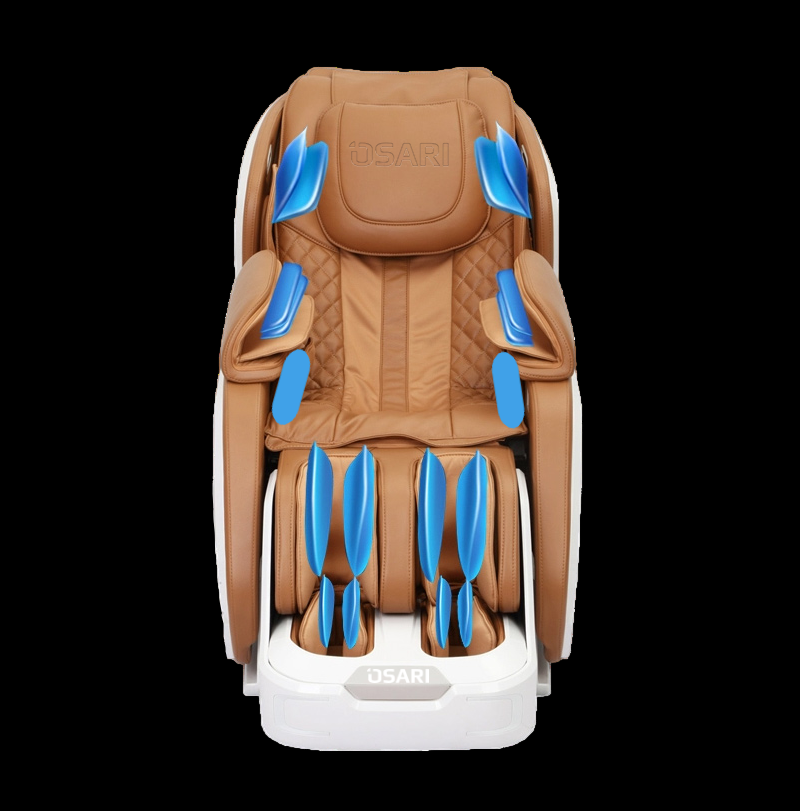 Массажные подушки расположены по всей массажной поверхности кресла выполняя комплексный лимфодренажный массаж, эффективно способствует ускорению обменных процессов в организме, восстановлению кровообращения в конечностях, нормализация тонуса сосудов, снимает усталость.
