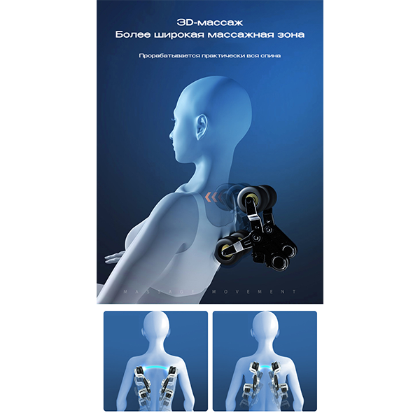- Функция 3D-массажа позволяет роликам работать в трёх плоскостях одновременно, обеспечивая эффективное воздействие на глубокие мышцы тела. Ролики двигаются вверх-вниз и вправо-влево, нацелено массируя определённые участки тела, а затем автоматически скрываются внутри кресла.