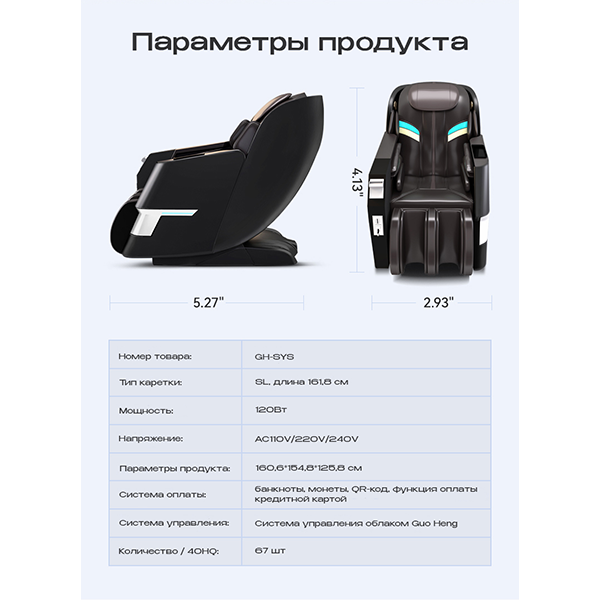 - Основная особенность — фиксация каркаса массажного кресла, при котором обеспечивается горизонтальный наклон 40 градусов. При этом ноги располагаются чуть выше головы.