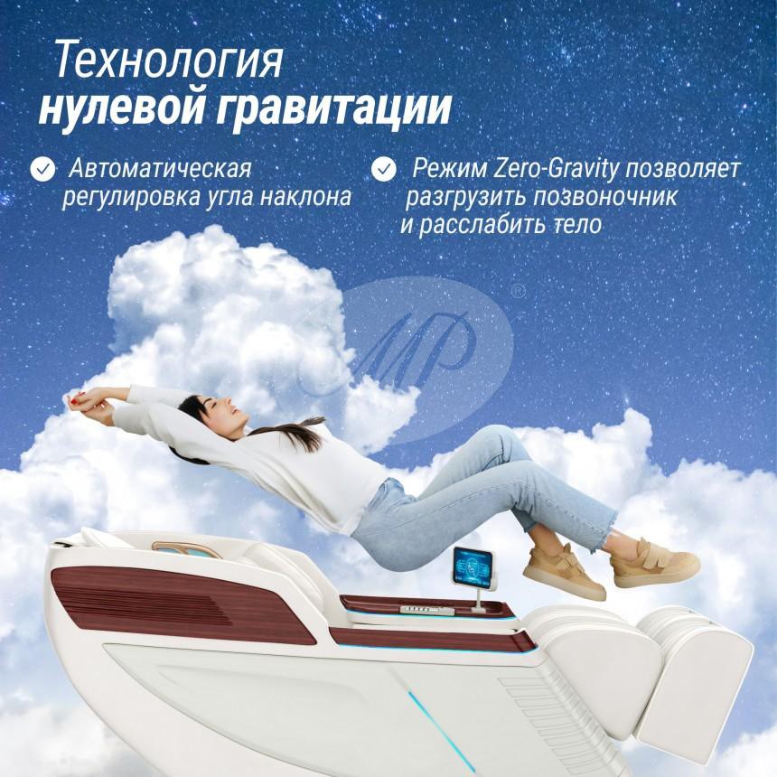 - ZERO GRAVITY. Активация ZERO-G автоматически наклоняет конструкцию под углом 40 градусов. Нагрузка распределяется равномерно по телу, возникает ощущение легкости, сравнимое с состоянием невесомости. С этой функцией тело находится в самом комфортном положении, оно максимально расслабленно, а значит, пользы от массажа будет гораздо больше, чем в любом другом положении. В состоянии невесомости нагрузка, действующая на позвоночник, равномерно распределяется по поверхности кресла. Снимаются спазмы в мышцах спины и шеи, улучшается кровообращение, восстанавливаются жизненно важные процессы, улучшается сон. ZERO-G подойдет для релаксации и оздоровления людей, занятых на тяжелых работах, офисных сотрудников, спортсменов, водителей авто, а также людей испытывающих большие нагрузки на работе и дома.