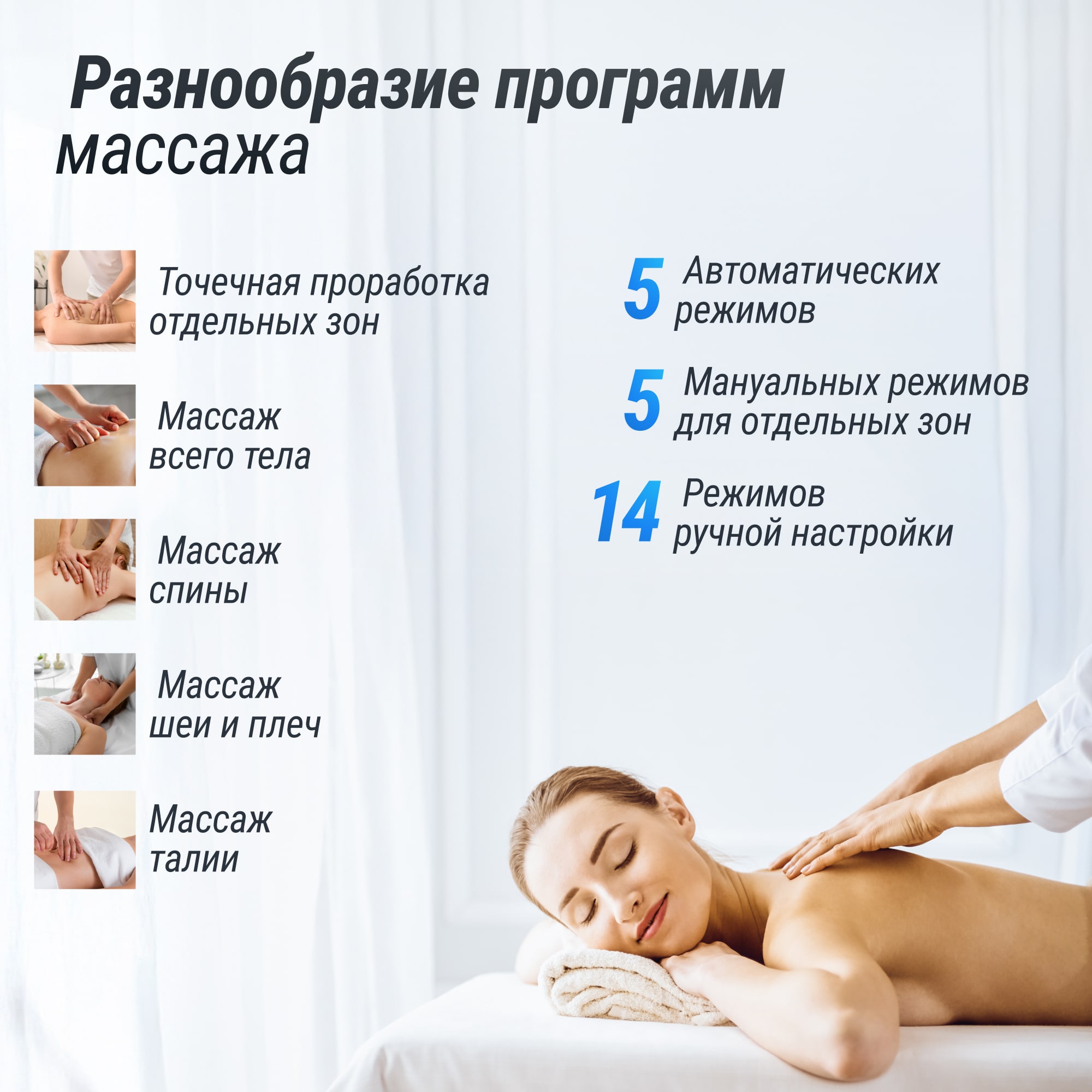 | Зоны массажа | плечи / ноги / руки / голень / ладони / спина / шея / грудь / поясница / ягодицы / бедра |